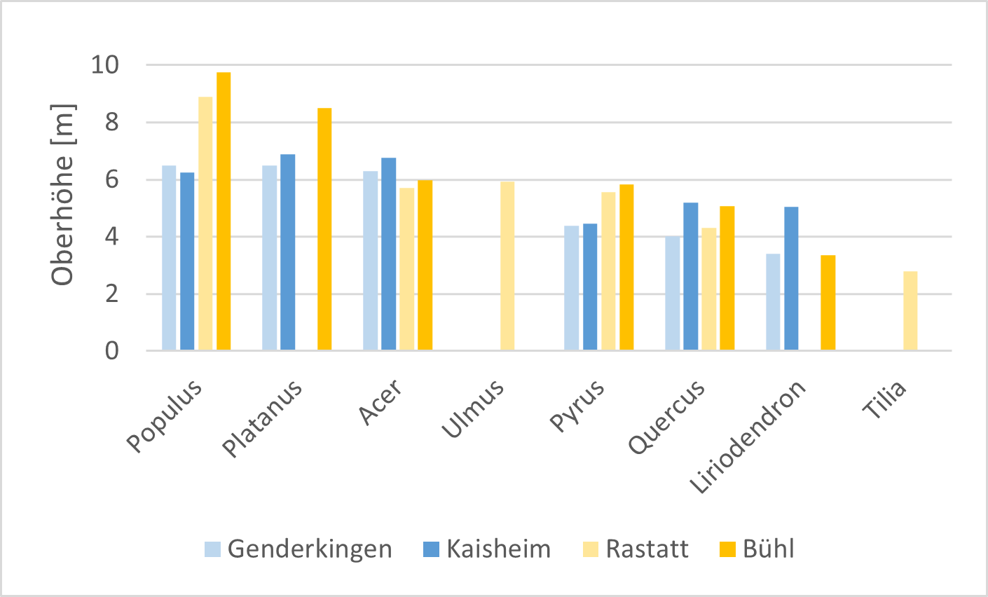 Innerhalb der Baumarten schwanken die Messwerte der Höhen stark. Die mittlere Höhe liegt oft in etwa bei der Hälfte der maximalen Höhe. Bei allen Baumarten gibt es kleine Exemplare: Kaisheim (3,9 m), Genderkingen (3,4 m) und Rastatt (3,3 m). Da in Rastatt mit Flatterulme und Winterlinde zum Teil andere Baumarten als auf den übrigen Flächen stehen, lassen sich die Werte jedoch nur eingeschränkt vergleichen. Die Baumhöhen von Schwarzpappel, Hybrid-Platane und Wildbirne fallen am Oberrheingraben im Schnitt höher aus als an der Donau. Die Gründe dafür dürften hauptsächlich im unterschiedlichen Klima mit höheren Temperaturen und einer längeren Vegetationszeit am Rhein liegen.