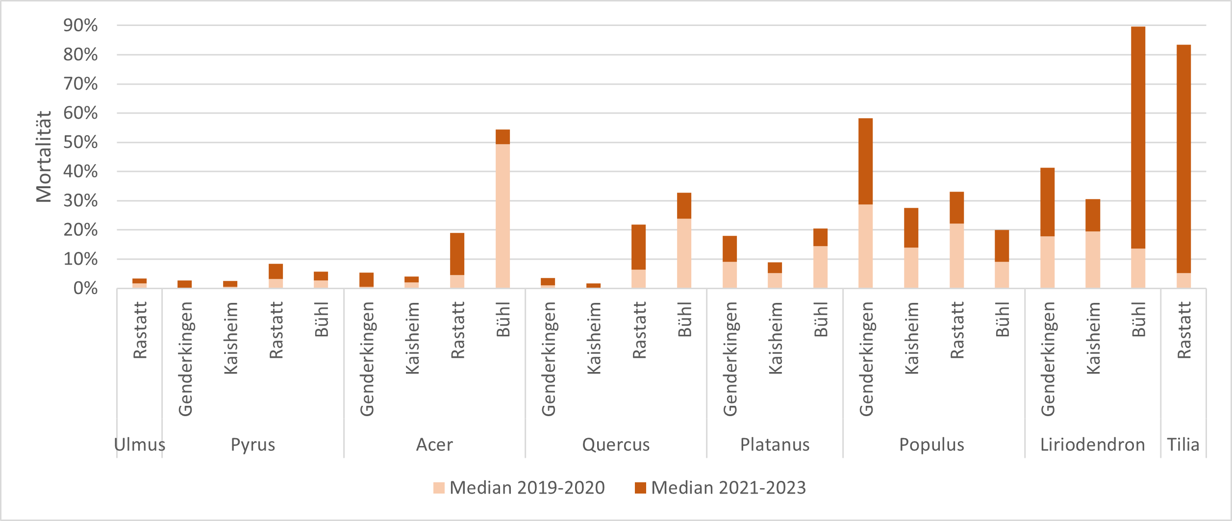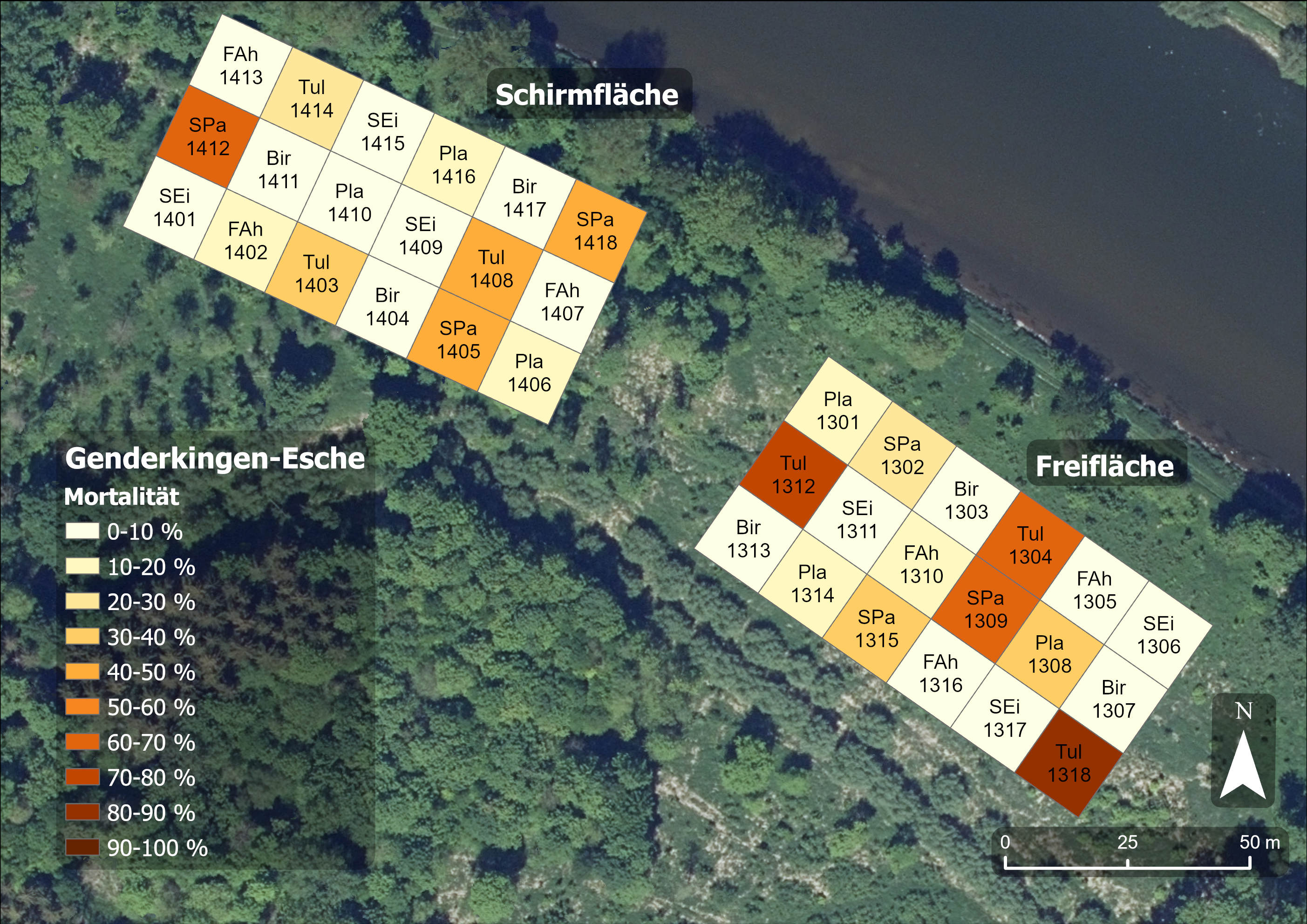 Die Gesamtmortalität über alle Baumarten ist mit 7 % auf den Kaisheimer Flächen am niedrigsten. Es folgen Genderkingen (14 %), Rastatt (20 %) und Bühl (27 %). Bei der Versuchsanlage kamen grundsätzlich Wuchs- und Netzhüllen zum Einsatz. Nur auf den Rastatter Flächen entschied man sich für chemischen Verbissschutz in Verbindung mit intensiver Bejagung. Im Vergleich zu den Flächen an der Donau ist der Ausfall hier etwa doppelt so hoch. Der Unterschied ist zum Teil durch den besonders hohen Ausfall der Winterlinde zu begründen, aber auch Wildbirne, Eiche und Feldahorn liegen deutlich über den Ausfallraten der Flächen an der Donau. Die nochmals höhere Mortalität in Bühl wird vor allem auf die Standortsbedingungen mit stagnierendem Wassereinfluss zurückgeführt.