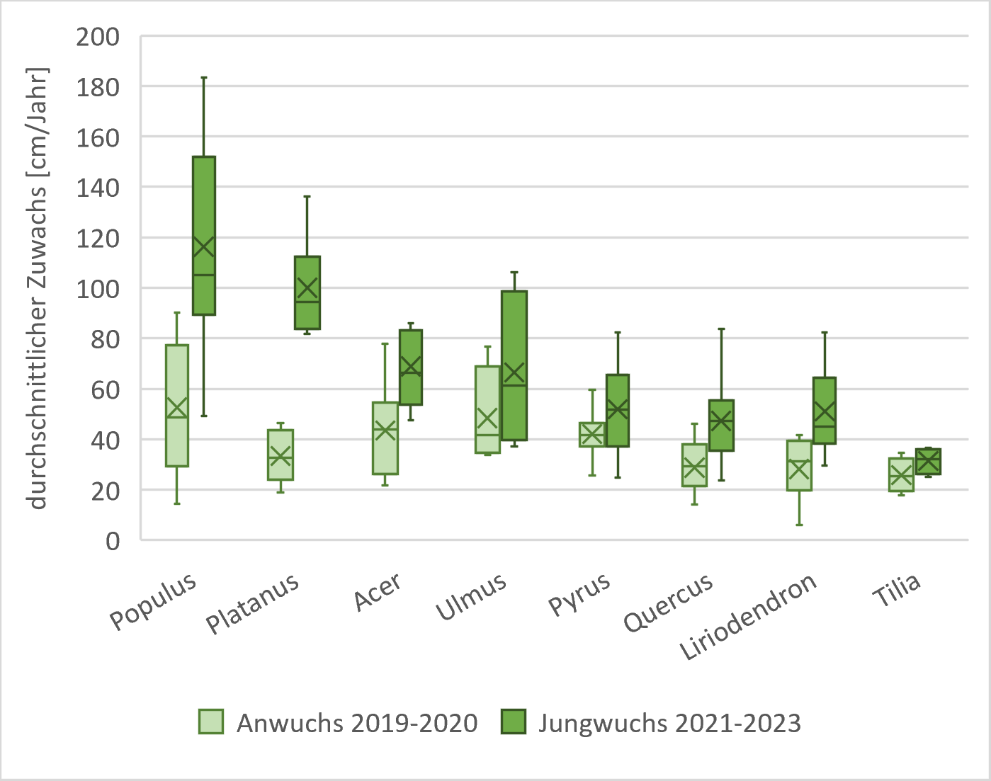 Der durchschnittliche jährliche Höhenzuwachs ist von der Anwuchs- zur Jungwuchsphase bei Schwarzpappel und Platane sprunghaft von 0,5 auf 1,1 m/Jahr bzw. von 0,3 auf 0,9 m/Jahr (Median) angestiegen. Die zuwachsstärksten Schwarzpappel-Parzellen erreichen Mittelwerte um 2 m/Jahr. Bei den anderen Baumarten ist zwar ein geringerer, aber trotzdem deutlich erkennbarer Anstieg von rund 0,3 m/Jahr auf rund 0,5 m/Jahr zu beobachten.