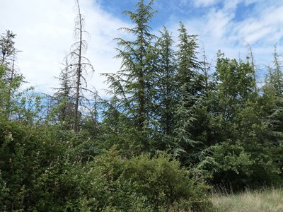 In kühlfeuchter Höhe bei Semons (1, Abbildung 2) trafen wir zu Beginn der Exkursion auf die letzten Exemplare eines Fichtenbestands (Picea abies). Die entstandenen Freiflächen werden gerade mit Flaumeiche (Quercus pubescens) und Douglasie (Pseudotsuga menziesii) aufgeforstet. Die Douglasie erfreut sich in Frankreich einer langen Tradition und Akzeptanz – allerdings sollen laut dem zuständigen Förster Douglasien künftig durch hitze- und trockenheitsresistentere Arten wie zum Beispiel der Flaumeiche ersetzt werden.