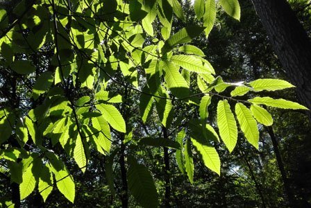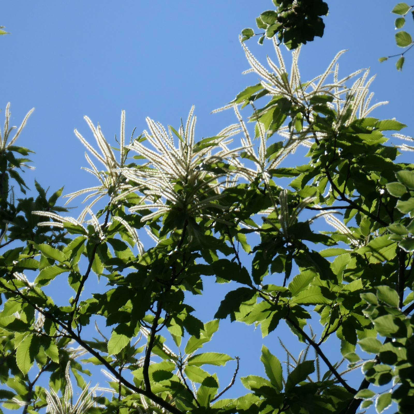 Auf ähnlicher Höhe bei Bossieu (2) zeigten sich in einem durchgewachsenen Mittelwald Buche (Fagus sylvatica) und Traubeneiche (Quercus petraea) gleichermaßen vital. 200 Höhenmeter tiefer hingegen, bei Charme sur l’Herbasse (3), erwies sich die Traubeneiche als vitaler. Sie wird dort zunehmend als Wertträger für die Mittelwaldwirtschaft geschätzt und ist mit Edelkastanie (Castanea sativa), Robinie (Robinia pseudoacacia) und Vogelkirsche (Prunus avium) vergesellschaftet. Die Edelkastanie ist aufgrund ihrer Fähigkeit zum Stockausschlag hier konkurrenzstark, wegen der Gefahr von Ringschäle und Rindenkrebs wird sie regional jedoch kaum gefördert. Robinie wird nicht gepflanzt, sondern aus Naturverjüngung geduldet. Trotzdem ist sie häufig und wird im Mittelwald auch gern als Lassreitel belassen. Die Vogelkirsche trafen wir regelmäßig als Mischbaumart an, sie präsentierte sich selbst an den wärmsten südlichen Exkursionspunkten noch vital.