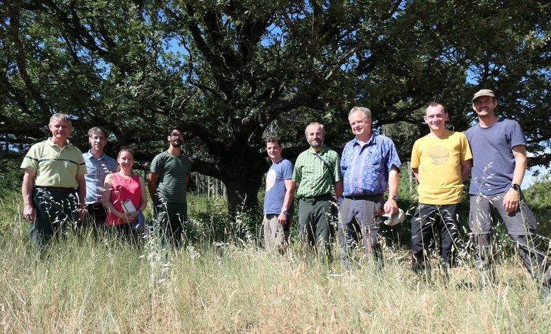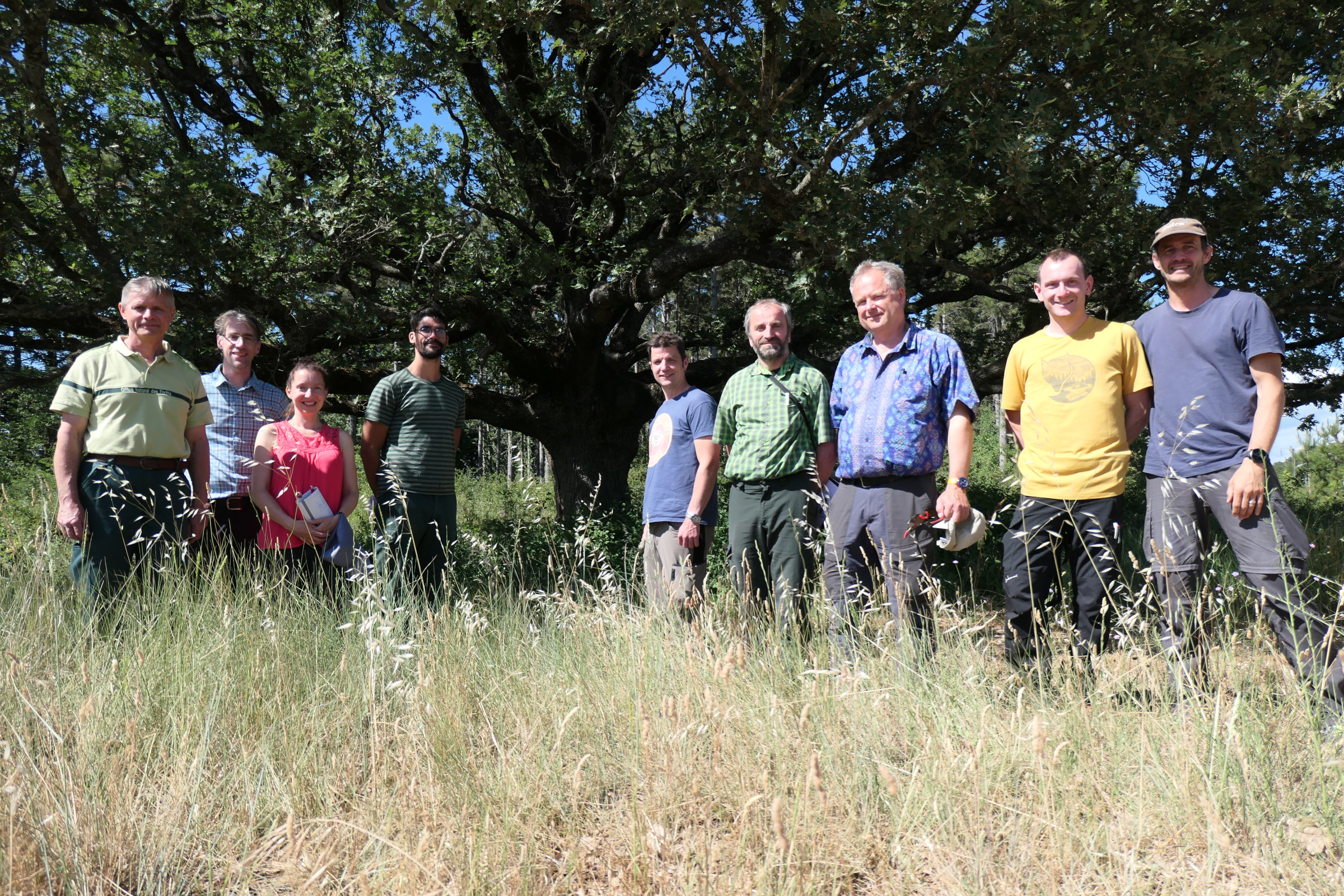 Abb. 7: Das Exkursions-Team aus Bayern mit Erwin Ulrich (1.v.l.) und Médéric Aubry (4.v.l.) von der ONF vor einer mächtigen Flaumeiche in der Nähe von Marsanne. Von bayerischer Seite (von links nach rechts): Steffen Taeger, Susanne Brandl, Markus Stapff, Johann Geiger, Markus Schaller, Benjamin Bußmann, Tobias Mette. Foto: LWF