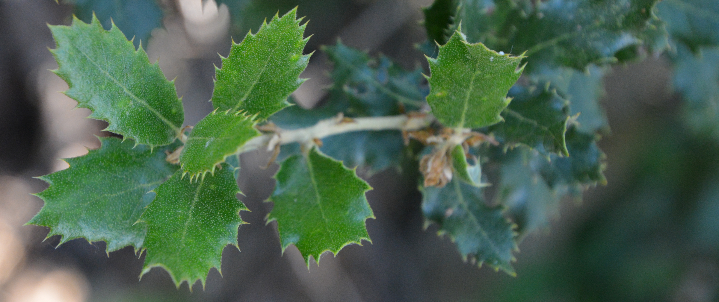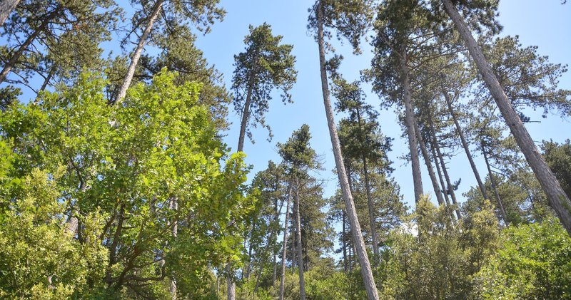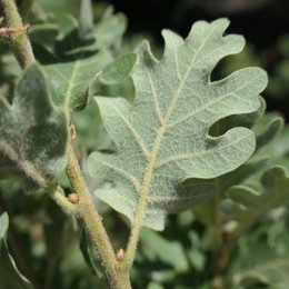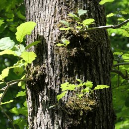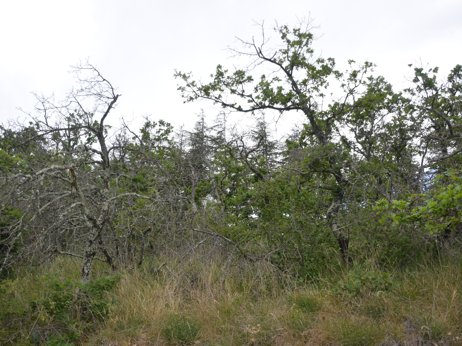 Die dominante Laubbaumart auf den trocken-heißen Standorten (6-8) war eindeutig die Flaumeiche (Quercus pubescens). Sie ist eine der Charakterarten mediterraner Wälder. Bereits bekannt aus Semons (1), nahm ihre Bedeutung auf den südlichen Exkursionspunkten sowohl als Nebenbaumart unter Schwarzkiefer (8) als auch in kommunalen Niederwäldern zum Beispiel bei Marsanne (7) zu. Selten war die Flaumeiche höher als 15 m – dass sie aber auch zu anderen Dimensionen fähig ist, zeigt Abbildung 7. Am heißesten Exkursionspunkt bei Allan (8) gesellte sich die noch trockenresistentere immergrüne Steineiche (Quercus ilex) zur Schwarz- bzw. Seekiefer und Flaumeiche.