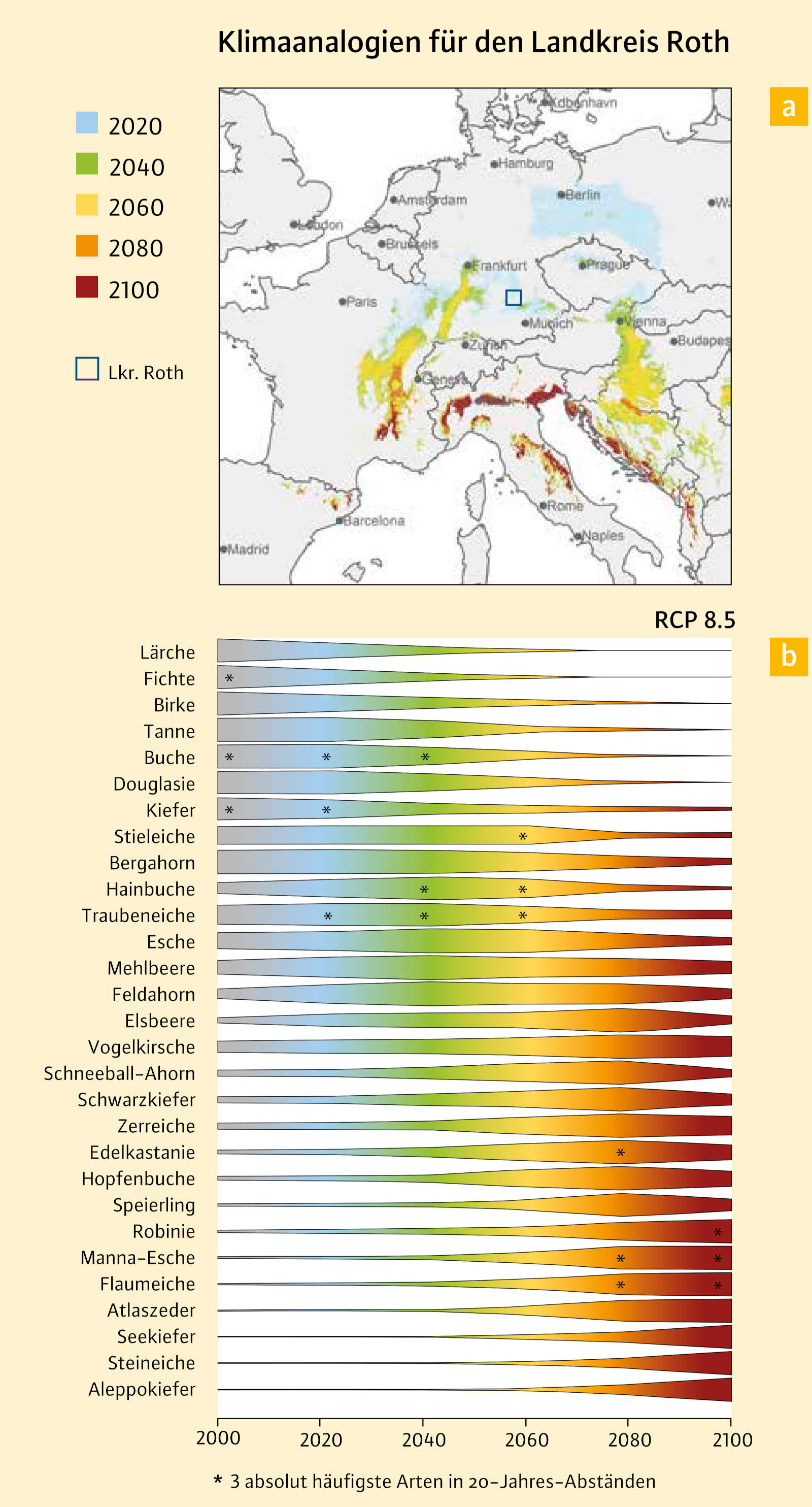 Abb. 1: Klimaanalogien für den Landkreis Roth. Die Analogkarte (a) verdeutlicht, wie sich mit fortschreitendem Klimawandel das analoge Klima immer weiter nach Süden verschiebt. Die Eiszapfengrafik (b) betrachtet das Artspektrum in den Analoggebieten: Die Zapfendicke zeigt die Veränderung der relativen Häufigkeit einer Baumart von 2000 bis 2100 entlang der Analogiegebiete.