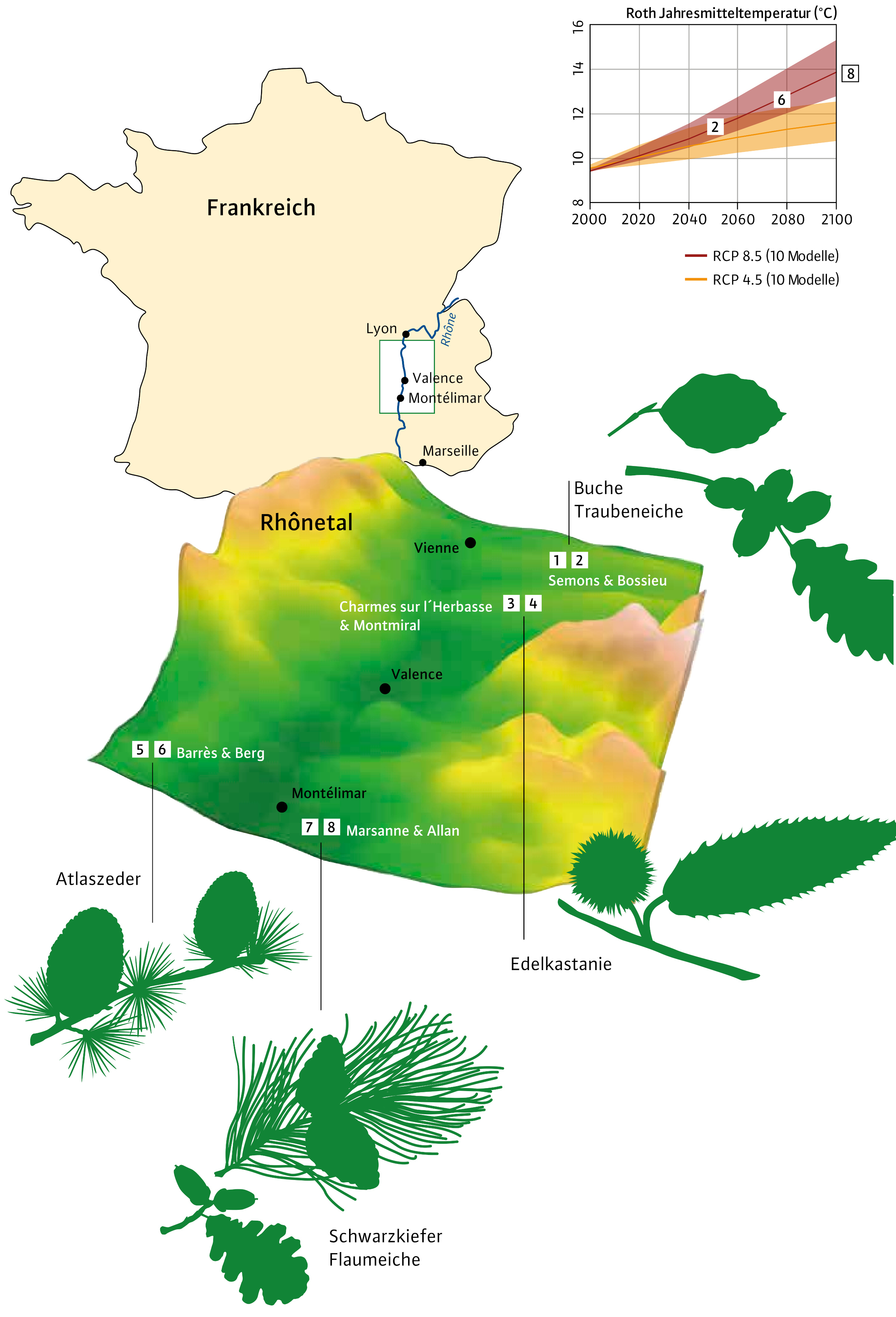 Am Anfang stand die Ermittlung der Analogregionen für das Projektgebiet, den Landkreis Roth, basierend auf den Vorhersagen von Klimamodellen. Sogenannte RCP-Szenarien (Representative Concentration Pathways) legen bestimmte Szenarien von Treibhausgaskonzentrationen fest, aus denen Klimamodelle die Klimaänderung berechnen. Für das milde Klimawandelszenario RCP 4.5 liegen Analogien für das Jahr 2100 zum Beispiel am Untermain und Oberrhein. Bei einem extremeren Szenario nach dem RCP 8.5 müssen wir uns wesentlich weiter südlich orientieren, zum Beispiel in die Vallée du Rhône (Abbildung 2). Nachdem wir im Jahr 2021 bei verschiedenen Exkursionen an Untermain und Oberrhein sehr beeindruckende Waldbilder kennenlernen durften, hatten wir uns für das Jahr 2022 die Vallée du Rhône vorgenommen.