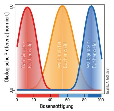 Die Buche, die sich seit ca. 7.000 Jahren in Deutschland ausbreitet, kommt bezüglich des Basenhaushalts in sehr differenzierten Pflanzengesellschaften vor. In Abbildung 2 sind die ökologischen Präferenzen der drei dominierenden Buchenwaldgesellschaften bezüglich der Basensättigung dargestellt. Die rote Kurve stellt die Präferenz der Hainsimsen-Buchenwälder (Luzulo-Fagetum) dar, die auf basenarmen Böden vorkommen. Die orangefarbene Kurve stellt die der Waldmeister-Buchenwälder (Galio-Fagetum) und die blaue Kurve die Waldgersten-Buchenwälder (Hordelymo-Fagetum) dar. Wie in der Einleitung erwähnt sind bei Buche polymorphe Anpassungsmechanismen bezüglich der Säuretoleranz beschrieben worden, weshalb eine Differenzierung nach dem Basenhaushalt sinnvoll erscheint.