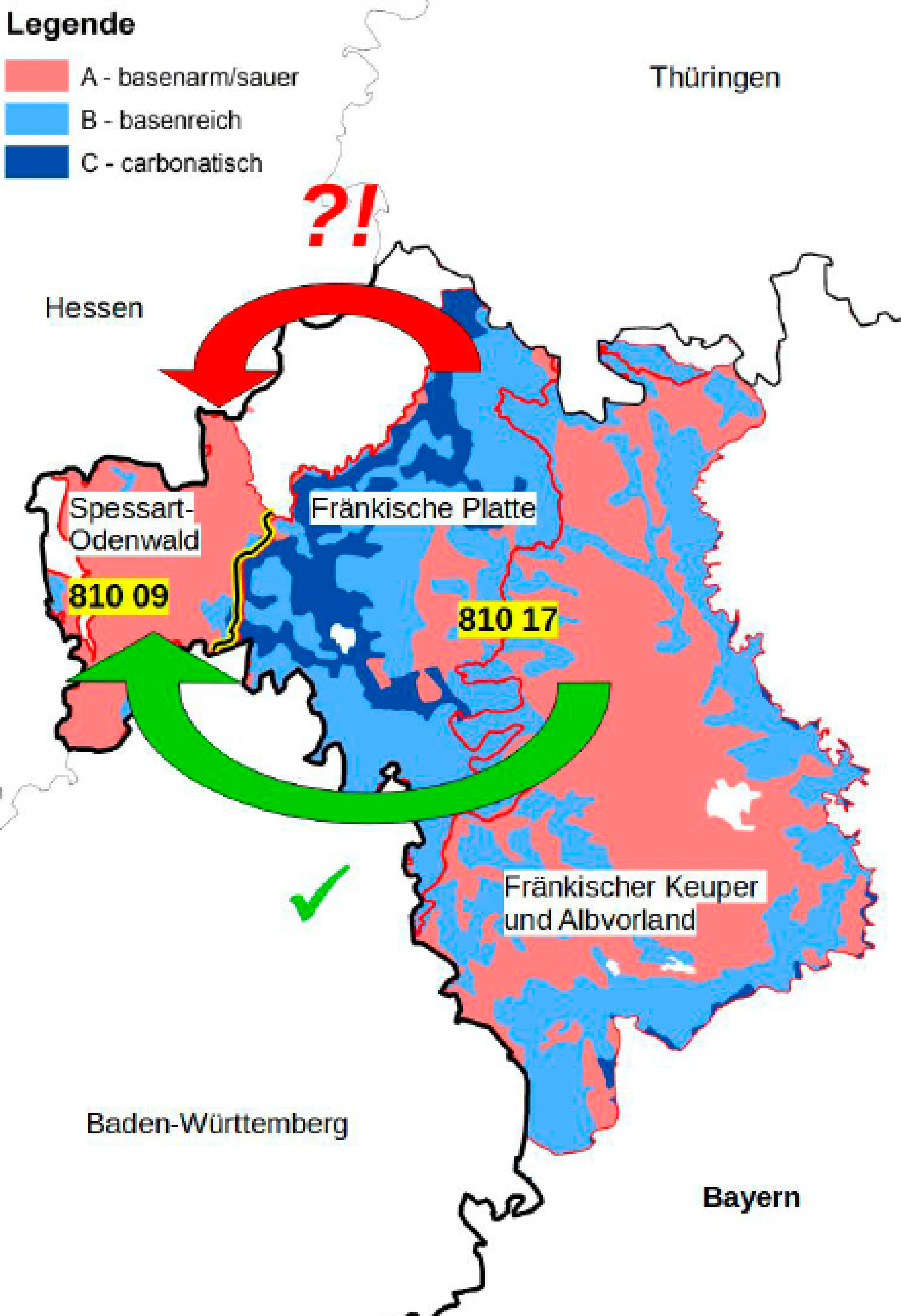 Da die Saat- und Pflanzgutherkünfte in Deutschland nach dem FoVG geregelt sind, wäre es ein längerer Prozess, dieses an neue Erkenntnisse anzupassen. Es kann nun aber nach den hier vorgestellten Karten innerhalb einer Herkunftsregion zwischen basenarmen, basenreichen und carbonatischen Bodenentwicklungen unterschieden werden. Nach dem FoVG ist für Buche die Herkunft 810 17 eine Ersatzherkunft für 810 09. Dies würde bedeuten, dass Buchen aus dem Muschelkalkgebiet der Fränkischen Platte gemäß FoVG zur Ausbringung im Buntsandsteinspessart geeignet wären. Berücksichtigt man jedoch die hier vorgeschlagene Dreigliederung nach Bodentypen, so würde für den Buntsandsteinspessart (810 09A) als Ersatzherkunft 810 17A, das heißt eine Herkunft aus dem Sandsteinkeuper des Steigerwaldes, in Frage kommen, was deutlich besser passt (vgl. Abb. 4). Diesbezüglich ließen sich noch viele weitere Beispiele finden.