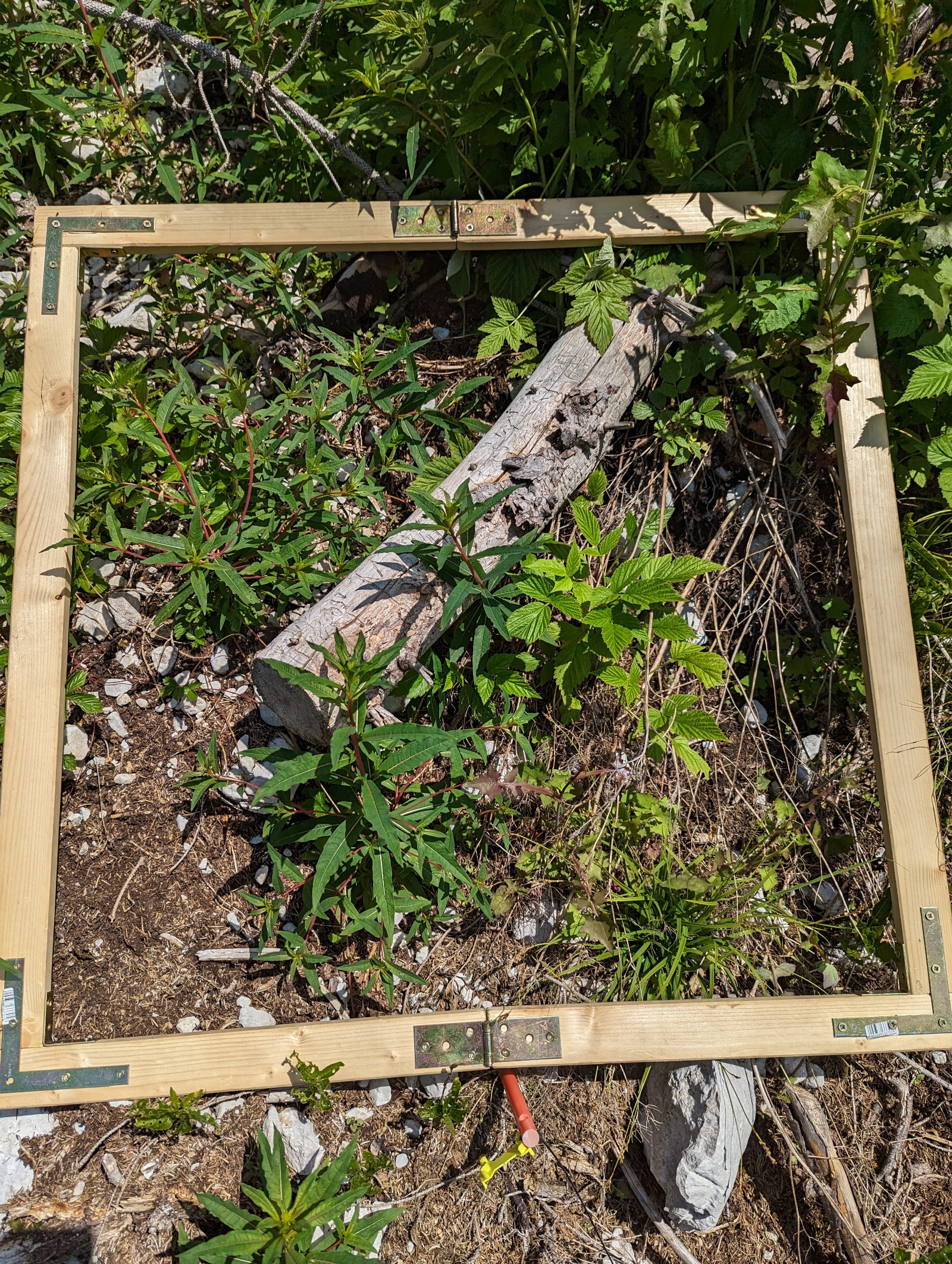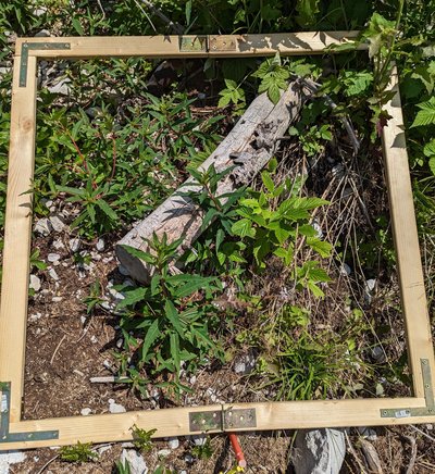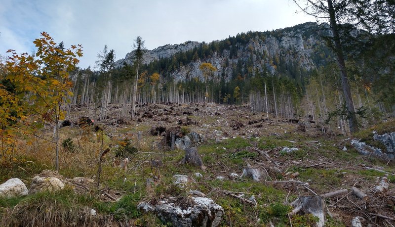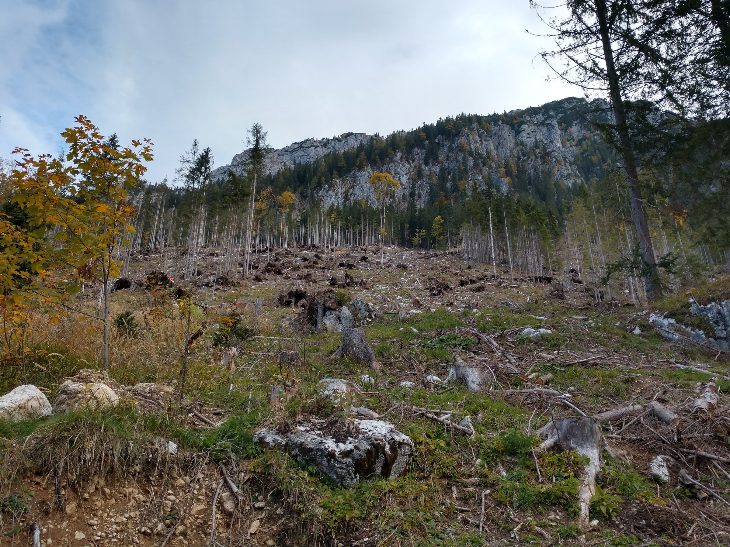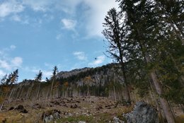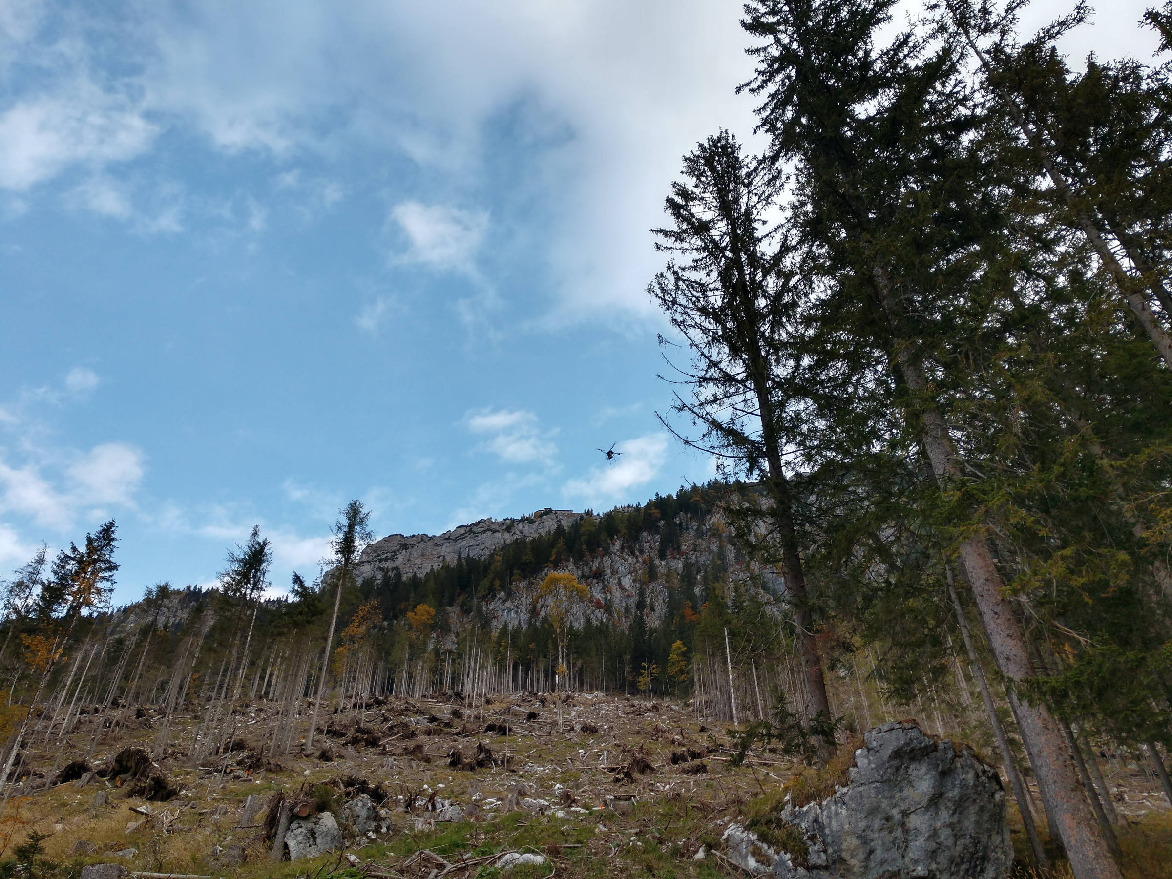 Eine Beispielsfläche zur Pioniersaat mittels Drohne wurde an der Scharitzkehlalm bei Berchtesgaden angelegt. Sie befindet sich auf einer Windwurffläche in einer Höhe von circa 1.220 m auf einem nach Südwesten ausgerichtetem Hang. Hier wurden im Spätherbst 2021 zwei Streifen mit den Maßen 10 x 40 m angelegt und besät. Zusätzlich wurden Kontrollparzellen angelegt. Im Frühjahr 2022 wurden auf beiden Streifen jeweils 10 x 10 m umzäunt. Geprägt sind die beiden Streifen von Wurzeltellern, Baumstümpfen und Felsen (Abbildung 2).