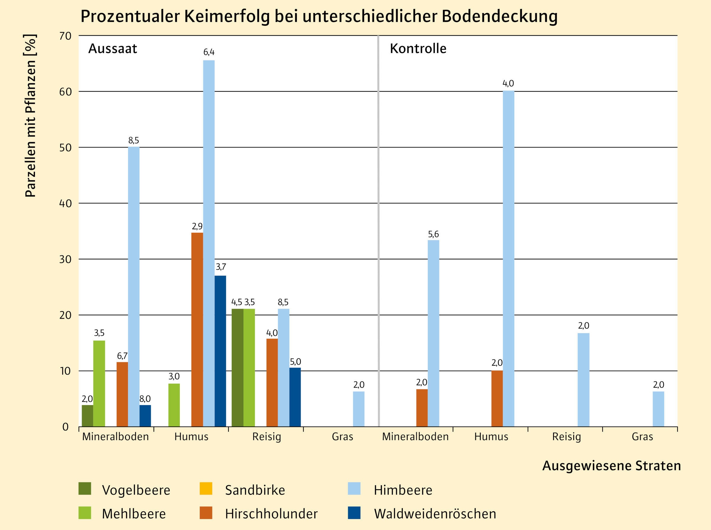 In der Gruppe der Bäume fanden sich bei Vogelbeere nur Keimlinge in den Straten "Mineralboden" und "Reisig", wobei der Keimerfolg bei Reisig mit im Durchschnitt 4,5 Keimlingen auf 20 % der Parzellen am größten war. Die Mehlbeere zeigte sich keimfreudiger, da sie zusätzlich auch im Stratum "Humus" vorhanden war. Auch hier war der Keimerfolg mit durchschnittlich 3,5 Keimlingen auf 20 % der Parzellen bei Reisig am höchsten.