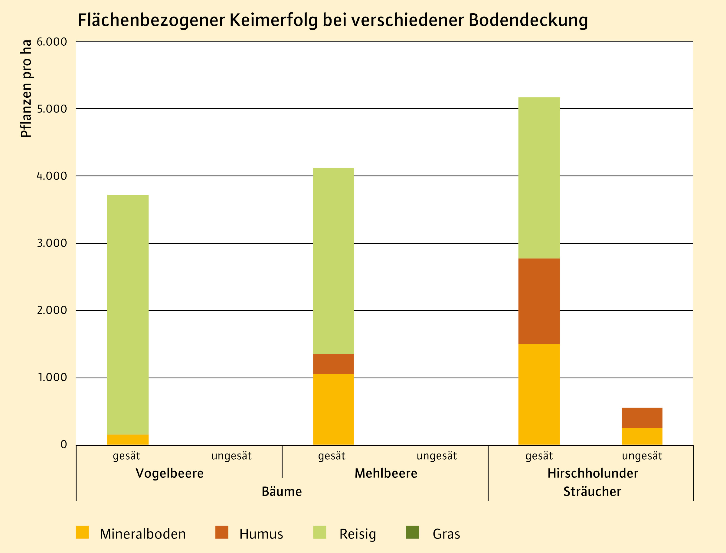 Es wird deutlich, dass einzig der Hirschholunder ohne eine aktive Aussaat keimt und dies flächenmäßig nur in geringem Umfang. In der Gruppe der Bäume bringt die gesäte Vogelbeere circa 3.700 Pflanzen pro ha hervor, wobei das Stratum "Reisig" die weitaus größte Bedeutung hat. Mit circa 4.100 Keimlingen pro ha zeigt die Mehlbeere bei den Bäumen den besten Saaterfolg – ihr Anteil kann bei zukünftiger Saat daher deutlich reduziert werden. Der Hirschholunder weist beim flächenmäßigen Aufkommen unter "Reisig" mit knapp 2.400 Pflanzen pro ha einen etwas geringeren Auflauferfolg auf als die beiden Baumarten. Da der Hirschholunder aber auch gut im Mineralboden und Humus keimt, bringt er die höchste Keimlingszahl der gesäten Arten hervor.