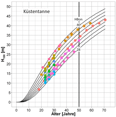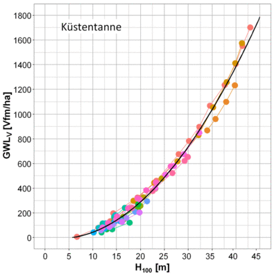 Die aus den Versuchsflächendaten berechnete Entwicklung von H100 und GWLV wurde für jede Baumart getrennt regressionsanalytisch untersucht. Die Modellergebnisse ermöglichten zum einen die Herleitung von Bonitätsfächern, zum anderen den schon erwähnten Leistungsvergleich mit heimischen Baumarten.