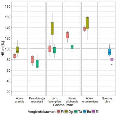 Abb. 5: Oberhöhenbonität der Vergleichsbaumart in Prozent der eingeführten Baumart.