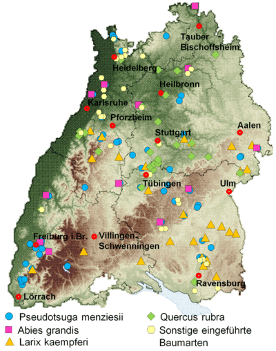Abb. 2: Lage der Versuchsflächen mit eingeführten Baumarten in Baden-Württemberg.