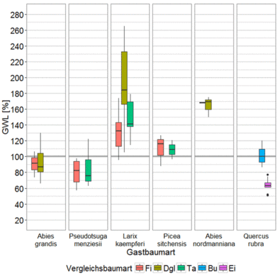 Der Leistungsvergleich ergab für Küstentanne und Douglasie sowohl in Bezug auf die Oberhöhenbonität HBon (Abb. 5) als auch auf die GWLV (Abb. 6) eine deutliche Überlegenheit gegenüber den heimischen Baumarten. Die Küstentanneist wiederum der Douglasie leicht überlegen. Während HBon bei der Japanlärche unter ähnlichen Wuchsbedingungen in etwa das Niveau von Fichte und Weißtanne erreicht, bleibt die GWLV deutlich hinter den beiden Vergleichsbaumarten zurück. Sitkafichte und Nordmannstanne liegen sowohl in Bezug auf die HBon als auch die GWLV hinter Fichte und Weißtanne. Die Roteiche erreicht mit beiden Kennwerten in etwa das Niveau der Rotbuche. Gegenüber der heimischen Eiche liegt sie in Bezug auf HBon um etwa 20%, in Bezug auf die GWLV um fast 40% höher. Für die anderen eingeführten Baumarten waren für einen Leistungsvergleich nicht genügend Versuchsanlagen in näherer Umgebung vorhanden.