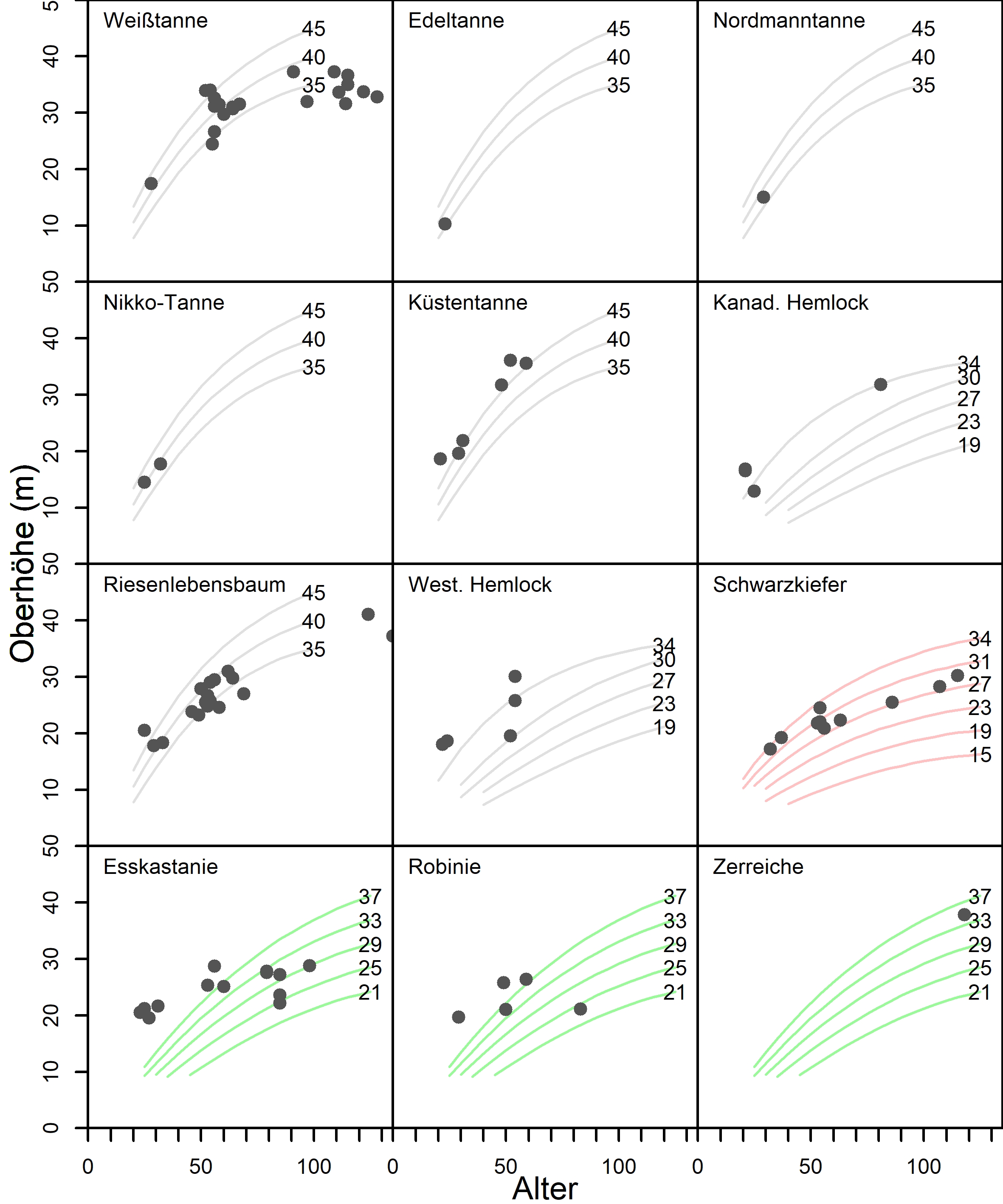 Um die Vergleichbarkeit bei verschiedenen Bestandesaltern zu gewährleisten, wurde für Baumarten mit ausreichender Altersabdeckung ein Modell angepasst, welches die Anzahl der Z-Bäume im Alter 50 berechnet (Abb. 5). Bei der Esskastanie liegen wir bei etwa 70 Z-Bäumen im Alter 50. Bei der Robinie ergaben sich 85 Z-Bäume pro ha, wobei wir bei ihr sehr große Qualitätsunterschiede in den Beständen vorfanden. Auch die Schwarzkiefer zeigte mit 115 potenziellen Z-Bäumen sehr starke Qualitätsunterschiede. Riesenlebensbaum und Weißtanne wiesen dagegen mit 110 und 90 recht konstante Anzahlen von Z-Bäumen auf. Auch wenn das nicht überragend ist für eine Nadelbaumart mit monopodialem Wachstum.