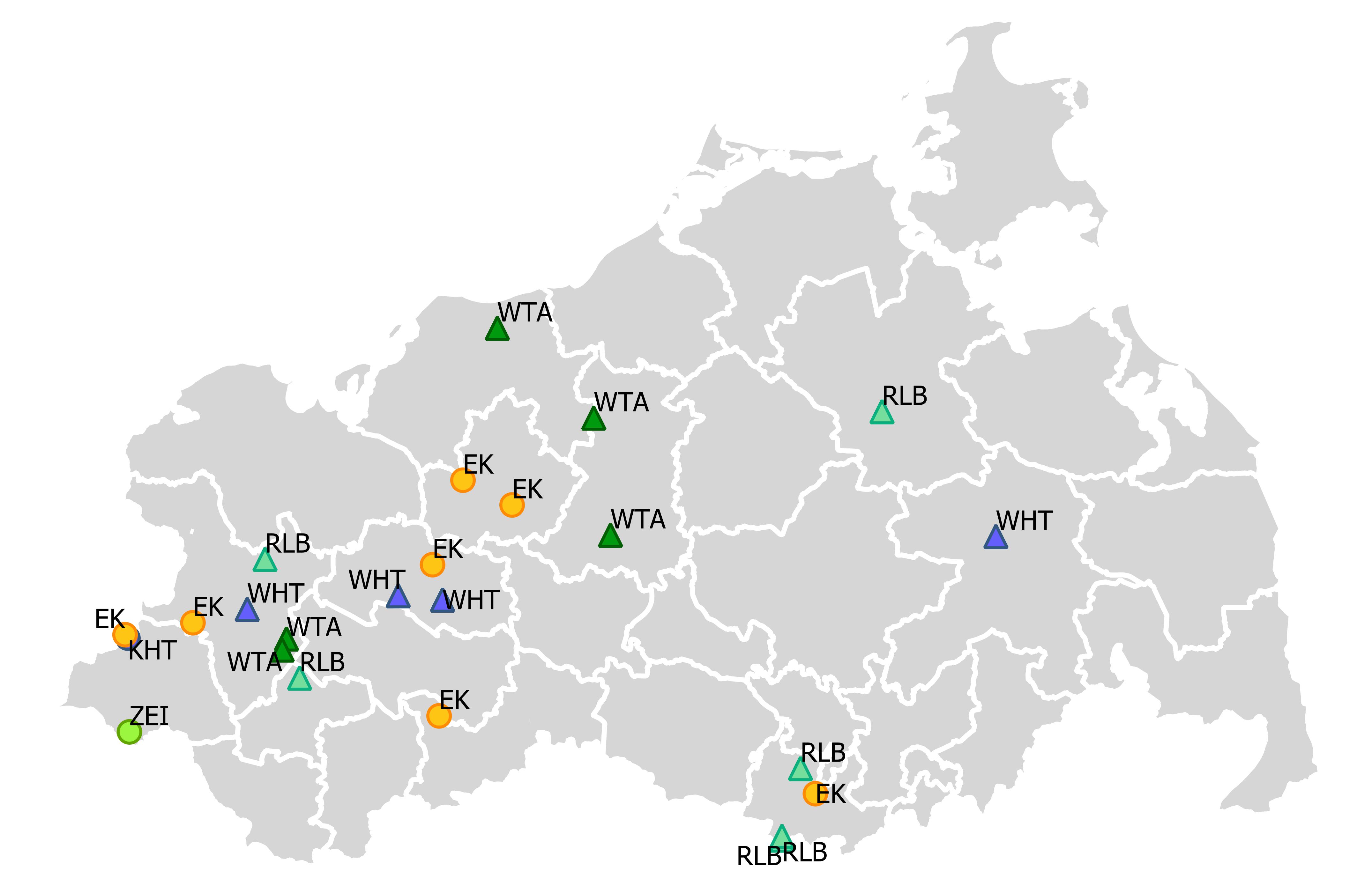 Abb. 1: 26 der 86 Versuchsflächen aus dem Projekt "BeNi in M-V". Die dargestellten Flächen gehen ins langfristige Messnetz des Versuchswesens ein und werden alle fünf Jahre waldwachstumskundlich aufgenommen. Abkürzungen: EK – Esskastanie, WTA – Weißtanne, RLB – Riesenlebensbaum, WHT – Westamerikanische Hemlocktanne, ZEI – Zerreiche. Quelle: E. Thurm