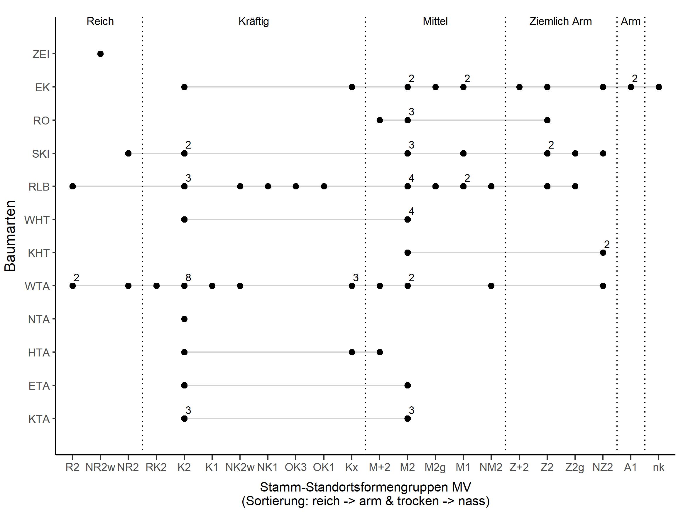 Abb. 4: Übersicht über die Standorte der 86 Versuchsflächen. Deutlich erkennbar ist die Dominanz auf den mittleren bis reichen Standorten. ZEI – Zerreiche, EK – Esskastanie, RO – Robinie, SKI – Schwarzkiefer, RLB – Riesenlebensbaum, WHT – Westamerikanische Hemlocktanne, KHT – Kanadische Hemlocktanne, WTA – Weißtanne, NTA – Nordmannstanne, HTA – Nikko-Tanne, ETA – Edeltanne, KTA – Küstentanne. Quelle: M. Werning.