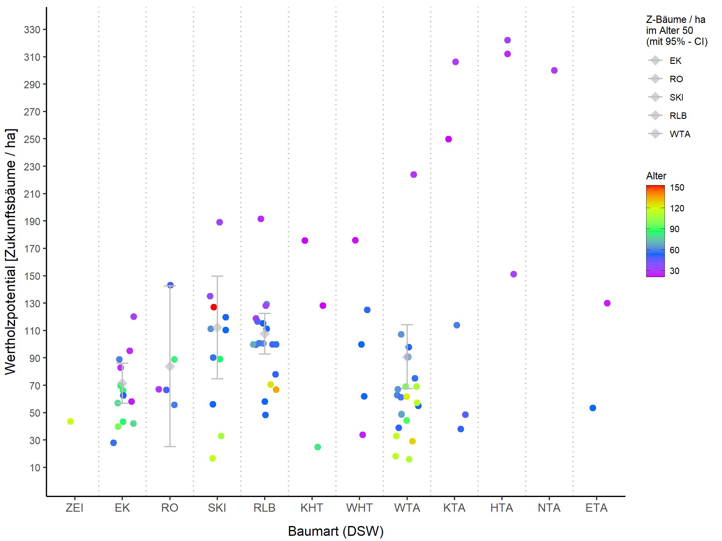 Die erreichbare Wuchsleistung (Quantität) ist selbstverständlich nur eines von vielen Entscheidungskriterien, die zur Empfehlung einer Alternativbaumart führen. Hinsichtlich der Holzverwertung spielt auch noch die Qualität eine wichtige Rolle. Wir haben dazu, als ersten Richtwert, in den Beständen alle potenziellen Zukunftsbäume gekennzeichnet. Diese Größe des Wertholzpotenzials sollte uns einen Eindruck geben, ob man in einem Bestand eine ausreichende Zahl Z-Bäume erlangt.