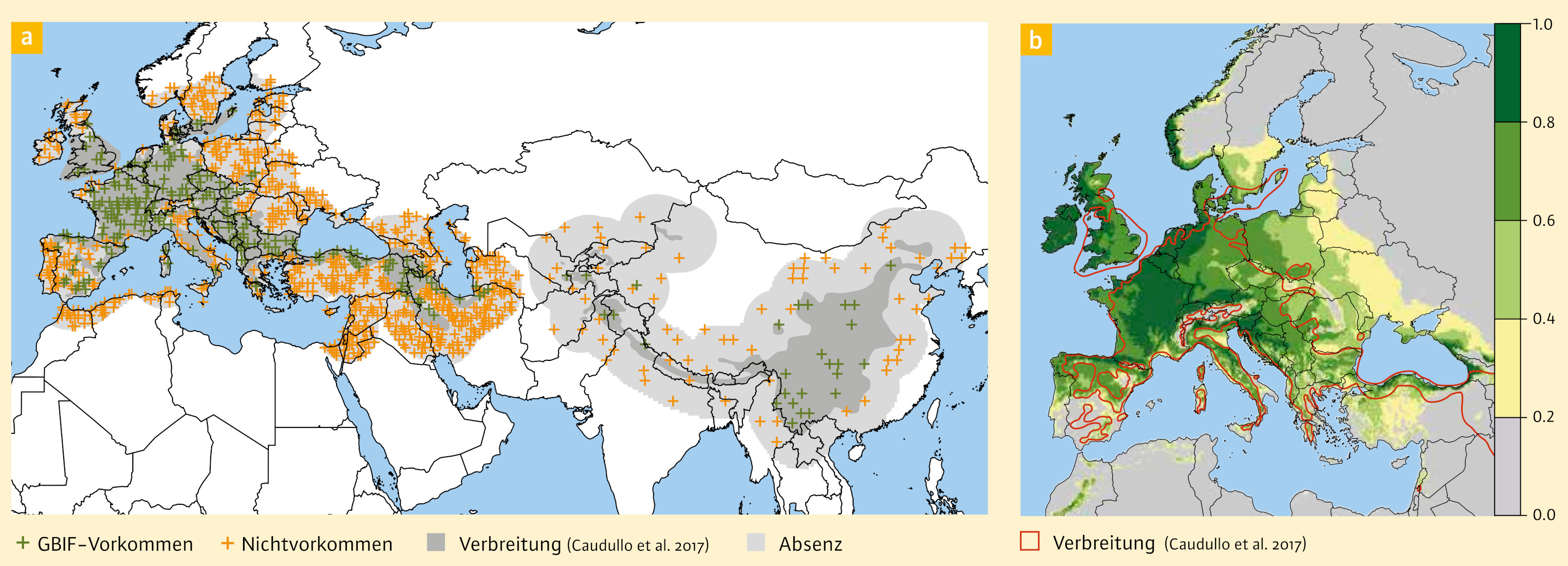 Abb. 3: Natürliche eurasische (a) und modellierte europäische (b) Artverbreitung der Walnuss als Waldbaumart. a: Die Verbreitungskarte in dunkelgrau entstammt Caudullo et al. (2017), die grünen Kreuze zeigen auszugsweise die dokumentierten GBIF-Vorkommen. Aus dem 400 km Puffer um die Verbreitungskarte in hellgrau werden die für das Artverbreitungsmodell benötigen Nichtvorkommen (= Absenzen) gezogen (orange Kreuze). b: Vorkommenswahrscheinlichkeit skaliert von 0-1 mit max. Wahrscheinlichkeit bei 1.