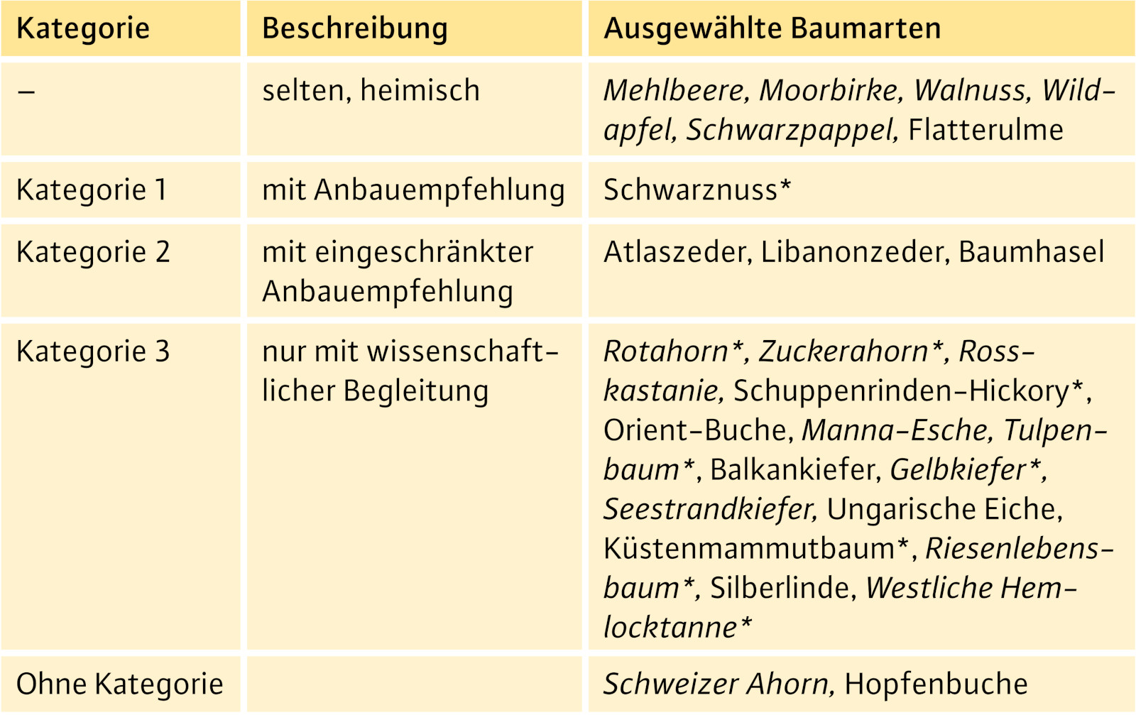 60 weitere und hierzulande zum Teil wenig bekannte Arten gelten nach den Leitlinien der Forstverwaltung als (potentiell) anbaufähig. Neben 15 bisher nicht erfassten seltenen heimischen Arten sind darunter auch 45 nichtheimische Arten: sechs mit allgemeiner Anbauempfehlung, 39 zunächst nur mit einer Empfehlung für Praxisanbauversuche.