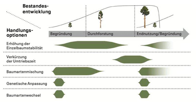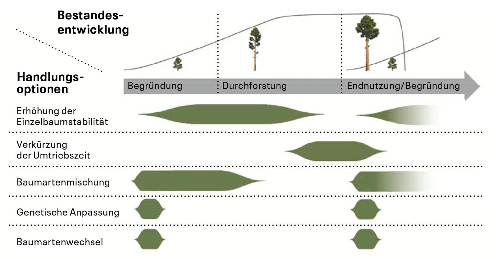 Bei einer solchen Zukunftsperspektive stellt sich die Frage: Wie kann der Waldbewirtschafter darauf reagieren? Maßgeblich haben sich fünf Handlungsoptionen herauskristallisiert (siehe auch Bolte et al. 2009; Brang et al. 2016; Thurm et al. 2017). Sie unterscheiden sich unter anderem im Zeitpunkt ihrer Anwendung im Bestandesleben und in ihrer Anpassungsstärke an den Klimawandel. Die Optionen werden im Folgenden bezüglich ihrer Anpassungsstärke aufgezählt (Abb. 3).
