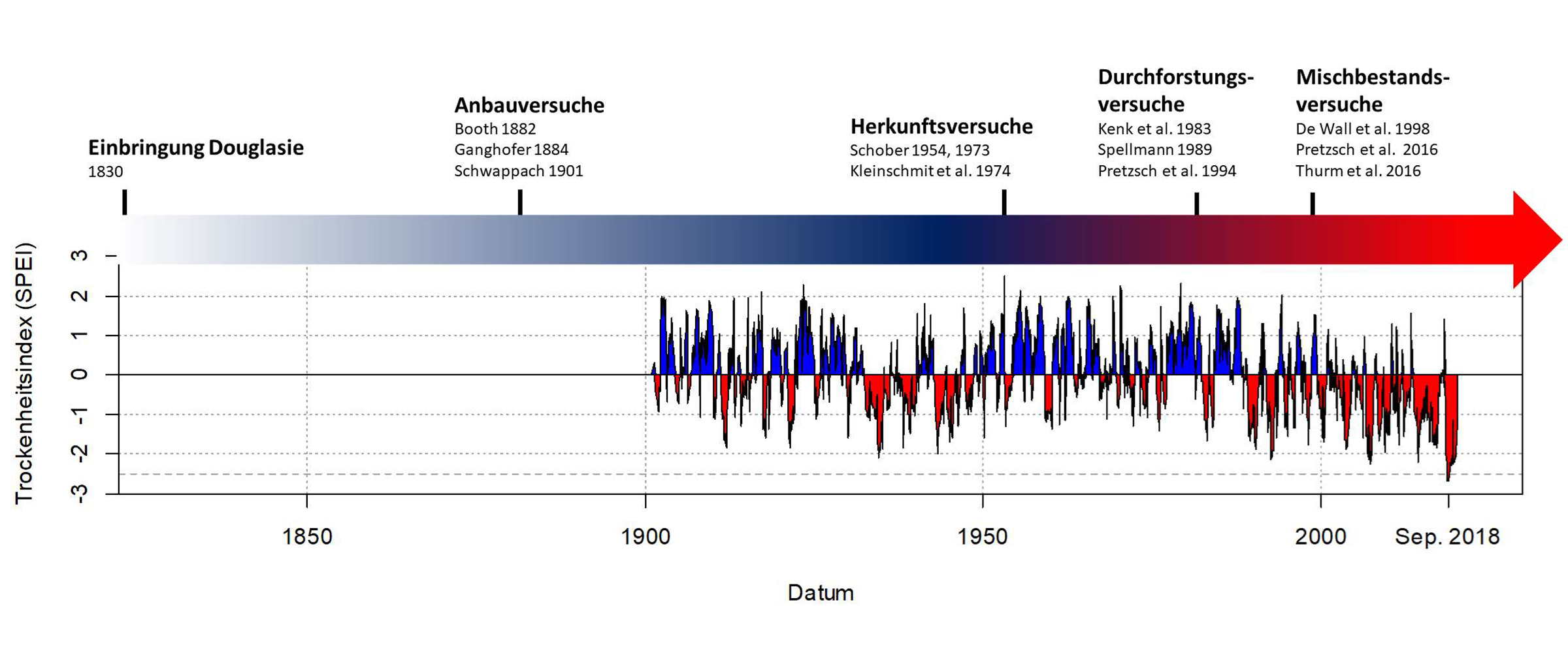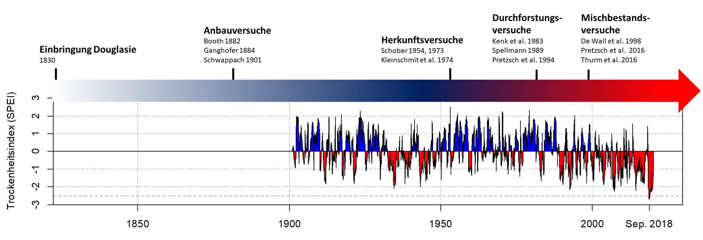 Abb. 1: Zeitstrahl zu den Versuchstypen, die notwendig sind, um eine neue Baumart fundiert in die waldbauliche Praxis einzugliedern, hier am Beispiel der Douglasie. Darunter befindet sich exemplarisch der Verlauf des Trockenheitsindex SPEI (Standardized Precipitation Evapotranspiration Index) für die langfristige Versuchsfläche Kiekindemark 23 mit 125-jährigen Douglasien (rote Bereiche = trockene Phasen, blaue Bereiche = feuchte Phasen). September 2018 erreichte die Fläche einen Dürrerekordwert von -2,7 (Datenbasis: Deutscher Wetterdienst 2020 , Abb. verändert nach Thurm und Falk 2018).