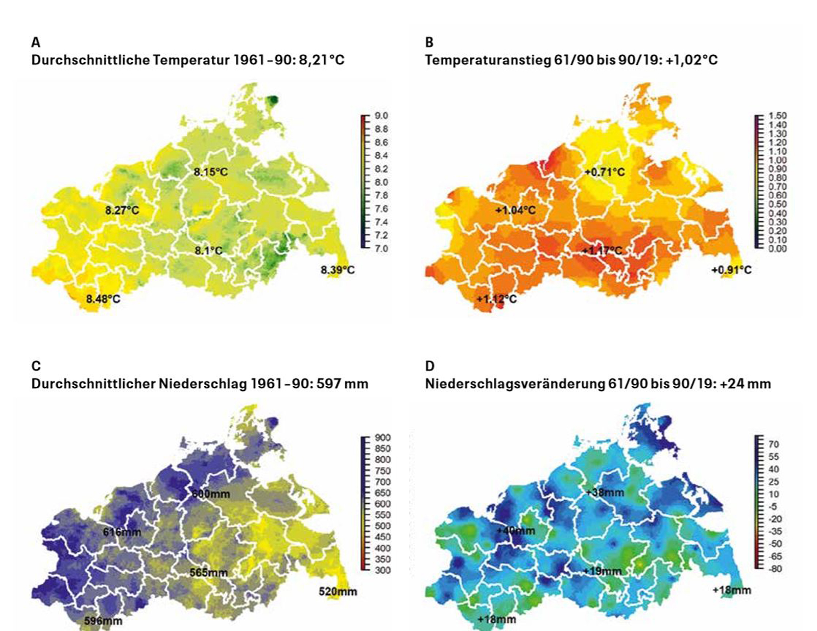 Abb. 2: Was ist schon geschehen? Darstellung der Jahresdurchschnittstemperatur (A) und der Jahresniederschlagssumme (C) für Mecklenburg-Vorpommern im Zeitraum 1961 bis 1990 und die Temperaturerhöhung (B) bzw. Niederschlagsveränderung (D) im Zeitraum 1990 bis 2019 zur Referenzperiode 1961 bis 1990 (Datenbasis: Deutscher Wetterdienst 2020).