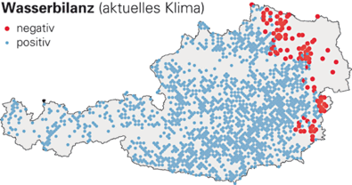 In Abbildung 3 ist die klimatische Wasserbilanz, das ist die Differenz von Niederschlag und potenzieller Verdunstung, bei aktuellem Klima (3 a) sowie bei einer Temperaturerhöhung um 3,6 °C aber gleichbleibendem Niederschlag (3 b) dargestellt. Die roten Punkte zeigen die Standorte, die derzeit bzw. bei erhöhter Temperatur nicht ausreichend mit Wasser versorgt sind bzw. sein werden.