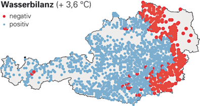 Abbildung 3 (b): Klimatische Wasserbilanz im österreichischen Wald bei einer Temperaturerhöhung von 3,6 Grad Celsius.