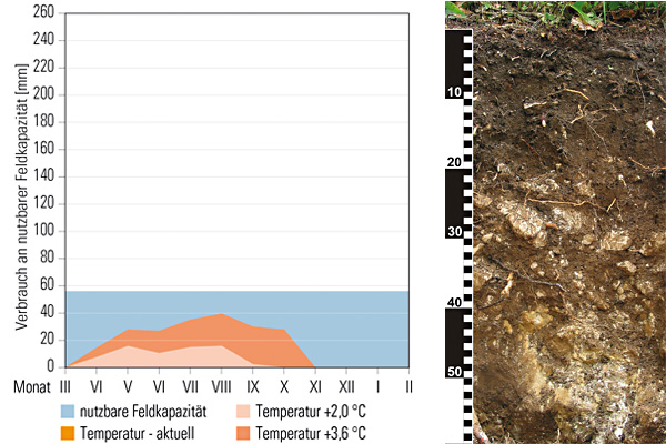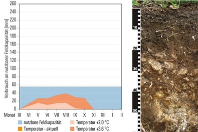 In Abbildung 2 sind zwei extreme Situationen verglichen. Der Standort im Weinviertel (2 a) hat eine hohe nutzbare Feldkapazität (240 mm). Unter den aktuellen Klimabedingungen ist das Wasser des tiefgründigen Bodens aber im Hochsommer verbraucht. Durch die Erwärmung und die damit verbundene Erhöhung der Verdunstung nimmt die Länge der Trockenklemme deutlich zu.