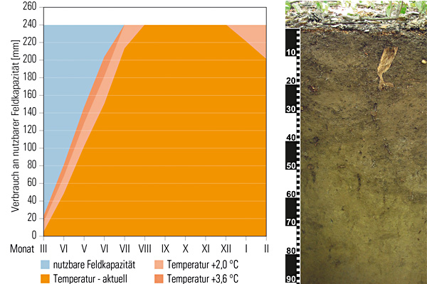 Der Boden auf Karbonatgestein (2 b) kann wesentlich weniger Wasser speichern. Seine Feldkapazität beträgt weniger als 60 mm. Durch den hohen Niederschlag und die geringe Verdunstung des wenig produktiven Bestandes wird die Feldkapazität weder derzeit noch in einem künftigen Klima ausgeschöpft werden.