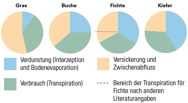 Bei Waldvegetation wird ein deutlich höherer Teil des Niederschlages als im Freiland über Interzeption und Transpiration an die Atmosphäre zurückgegeben (Abbildung 1):