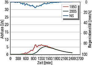 Die Weidefläche hätte beim 2005er-Ereignis wesentlich früher Abfluss geliefert (nach sieben Stunden), der Fichtenbestand reagiert erst nach 14 Stunden. Die Abflussspitze wird auf der Weidefläche bereits nach 16 Stunden, im Bestand erst nach 22,5 Stunden, auf geringerem Niveau, erreicht.
