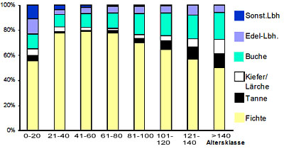 Die Bergwälder weisen im Schnitt ein deutlich höheres Alter auf als die Bestände im Flachland. Dieses hohe Alter der Bergwälder ist für sich allein gesehen noch kein Grund zur Besorgnis. Kritisch wird die Situation allerdings, wenn man die Baumartenzusammensetzung betrachtet. Der typische Bergmischwald aus Fichte, Tanne und Buche ist vielfach nur noch in Beständen über 130 Jahren vorhanden. In den 20 bis 80 Jahre alten Wäldern ist der für die Erhaltung der Boden- und damit Hochwasserschutzfunktion so wichtige Tannenanteil stark zurückgegangen und beträgt nur noch rund 1 %. Gleichzeitig nehmen gleichförmige und labile Fichtenreinbestände in dieser Altersspanne einen besonders großen Anteil ein.
