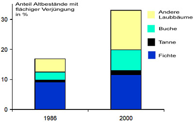 Bei dieser Ausgangslage kommt einer rechtzeitigen und ausreichenden Verjüngung der Bergwälder eine besondere Bedeutung zu. Eine stufige Dauerbestockung aus den Hauptbaumarten des Bergmischwaldes lässt sich nur über eine funktionierende Verjüngung auf großer Fläche erreichen. Verjüngung bedeutet dabei soweit als möglich Naturverjüngung, da Pflanzmaßnahmen im Bergwald aus technischen und finanziellen Gründen auf Ausnahmefälle beschränkt bleiben müssen.