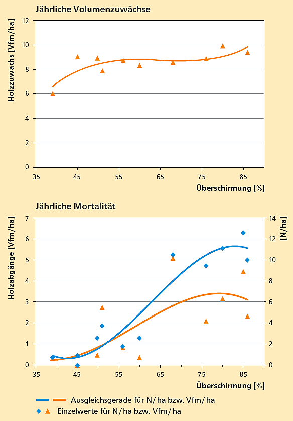 Alle Parzellen leisteten einen annähernd gleichen durchschnittlichen Volumenzuwachs, im Bereich zwischen 7,8 und 9,9 Vorratsfestmetern. Nur die am stärksten aufgelichtete Schirmhiebsparzelle hatte mit 6,0 Vorratsfestmetern pro Jahr einen niedrigeren Wert (Abb. 2).