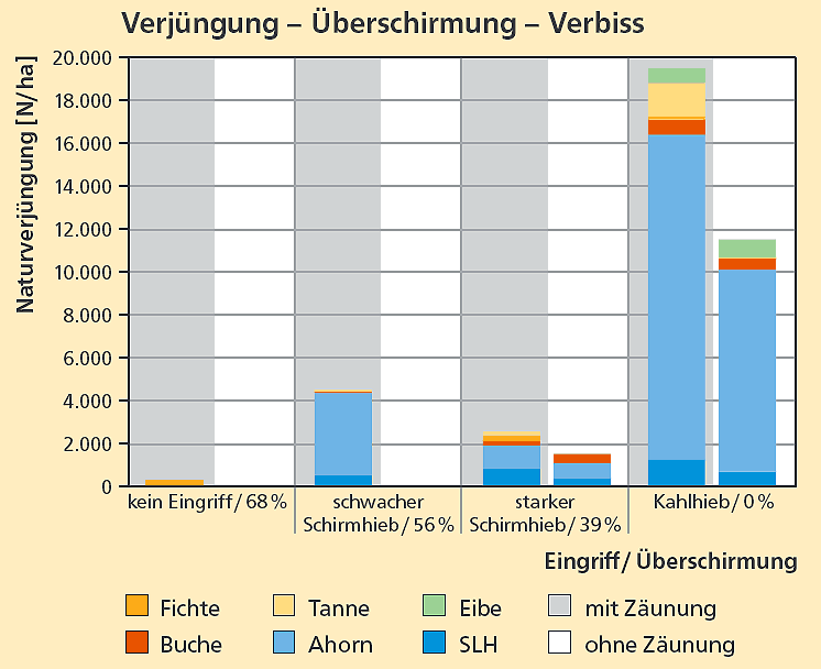 Die bisher dargestellten Ergebnisse beziehen sich alle auf die während des ganzen Versuchszeitraums gezäunten Parzellen. Auf den Teilflächen, die nicht vor Wild geschützt waren, beeinflusst im Wesentlichen der Wildverbiss das Überleben und die Entwicklung der Verjüngung (Abb. 3). Die Verjüngungsdichten auf den Teilparzellen mit Zaunschutz sind – abgesehen von den ganz dicht beschirmten Flächen – regelmäßig höher als auf den ungezäunten Parzellen. Die Verjüngungssituation ist vor allem deshalb so unbefriedigend, weil die Artenzusammensetzung nicht den Zielvorstellungen entspricht. Mit einigen wenigen Ausnahmen auf der Kahlhiebsfläche finden sich außerhalb der Zäune weder Tannen noch Eiben, die höher als 1,3 Meter sind.
