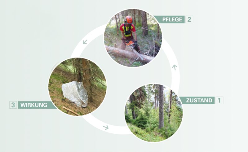 Der Kreislauf Zustand – Pflege – Wirkung bildet zusammen mit der LeiNa-Datenbank die Grundlage für eine erfolgsversprechende, effiziente Schutzwaldpflege.