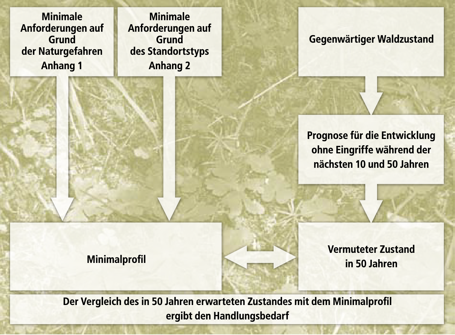Um den Handlungsbedarf festzustellen, vergleicht der Forstdienst den aktuellen Waldzustand mit dem gewünschten Waldzustand aus dem Anforderungsprofil des betreffenden Waldstandortstyps. In die Beurteilung mit einbezogen wird die mit viel Wissen und Erfahrung unterlegte Prognose für die natürliche Waldentwicklung (ohne Eingriffe) der nächsten 50 Jahre. Das Minimalprofil, d.h. die minimalen Anforderungen auf Grund der Naturgefahren und des Standortes, dient als Messlatte für diesen Vergleich. Es besteht Handlungsbedarf, wenn der erwartete Waldzustand schlechter ist als das festgelegte Minimalprofil, er sich in eine unerwünschte Richtung entwickelt, und wenn wirksame und verhältnismässige Massnahmen zur Verbesserung angewendet werden können.