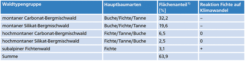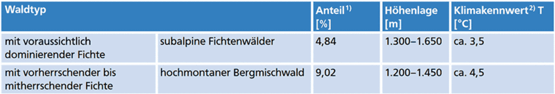 Für den Klimawandel besonders anfällig sind die Alpen. Die Erwärmung fiel in jüngster Zeit ungefähr dreimal so stark aus wie im weltweiten Durchschnitt. Nach einem regionalen Klimamodell ist mit einem Temperaturanstieg von knapp zwei Grad Celsius zu rechnen. Das optimale Großklima der Fichte liegt bei Jahresmitteltemperaturen zwischen 5 °C und 7,5 °C. Für die Fichte würde das bedeuten, dass sie in den subalpinen und hochmontanen Lagen ihre dominierende Stellung behalten könnte (Tab. 2). Allerdings wird sie hier einer stärkeren Konkurrenz durch die klassischen Mischbaumarten des Bergmischwalds, Tanne und Buche, ausgesetzt sein.