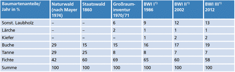 Die seit nahezu 2.000 Jahren anhaltende menschliche Einflussnahme im Naturwald hat die Baumartenzusammensetzung zugunsten der Fichte und zu Lasten der Buche verändert (Tab. 1). Die "industrielle" Holznutzung bediente sich flächiger Hiebsformen und war eher an Nadel- als an Buchenholz interessiert. Die bäuerliche Waldnutzung entnahm dagegen nur einzelne Stämme, wodurch im Privatwald in der Regel ein stufig ungleichmäßiger Waldaufbau erhalten blieb.