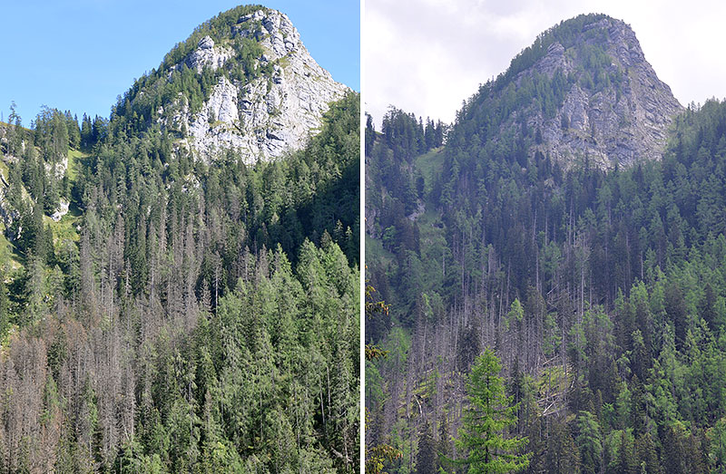 Abb. 2: Borkenkäfernester im Hochgebirge führen langfristig zum Verlust der Schutzfunktionen (Fotos: F. Binder).
