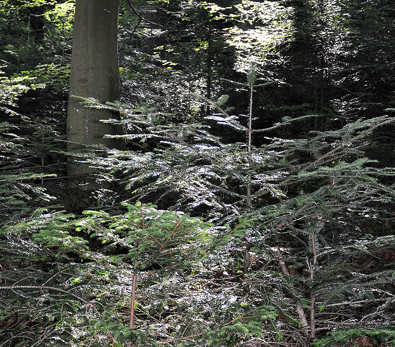 Auch auf besser nährstoffversorgten Standorten hat die Fichte Probleme in der Verjüngung Fuß zu fassen und sich zu etablieren. Wo die Konkurrenzkraft der Mischbaumarten nicht durch überhöhten Wildverbiss herabgesetzt ist, ist die Fichten- tendenziell der Buchen-, Ahorn- und Tannenverjüngung unterlegen. Durch entsprechende waldbauliche Maßnahmen kann der Fichte hier jederzeit geholfen werden.