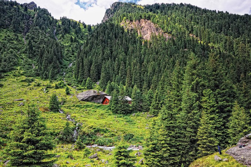 Abb. 1: Die Fichte ist die Hauptbaumart in Österreich, auch im Schutzwald. Auf dem Bild ist eine Hütte im Zillertal in Tirol zu sehen.