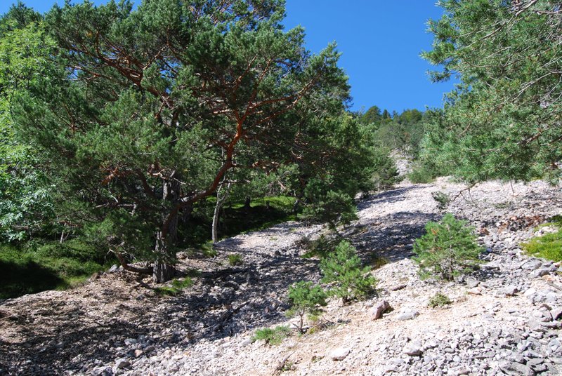 Der Wanderpfad führt über die Almfläche zwischen Latschenfeldern durch und mündet in einen geschlossenen Nadelwald mit Fichten, Tannen und Zirben. Solche Schutzwälder verhindern gerade in den höheren, schneereichen und steilen Lagen der Alpen den Anbruch von Lawinen. Schnee, der auf die Baumkronen fällt, verdunstet zum einen dort, zum anderen fällt er ungleich verteilt hinunter, was den schichtweisen Aufbau der Schneedecke und die Bildung von störungsanfälligen Schwachschichten verhindert. Ausgangspunkt für Schneebretter etwa.