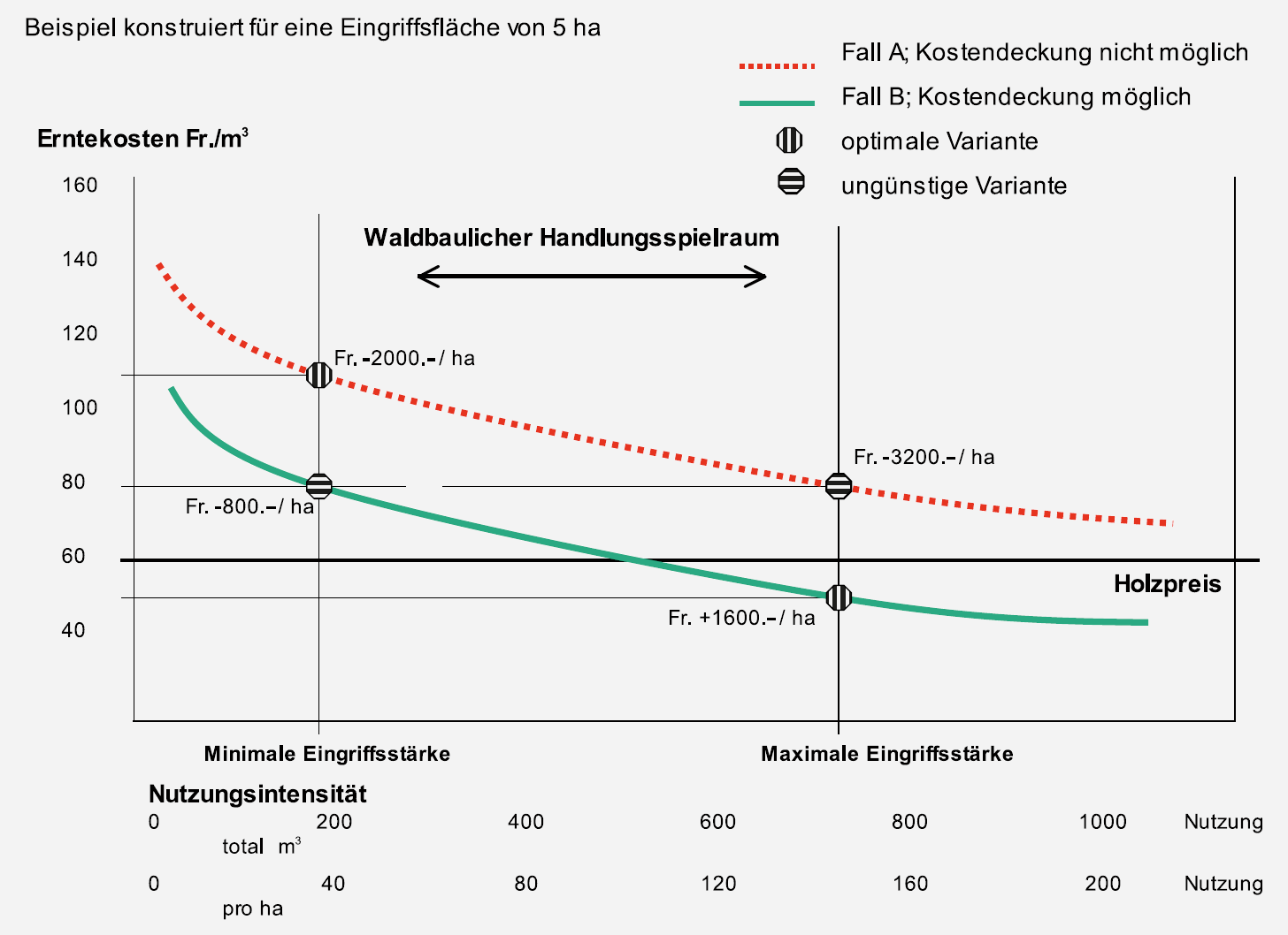 Die Kosten pro m3 genutztes Holz sinken in der Regel mit zunehmender Eingriffsstärke, insbesondere bei Seilschlägen. Aus der Sicht der Schutzfunktion sind jedoch nicht die Kosten pro m3, sondern jene pro behandelte Fläche relevant (Abb. 3). Eine maximale Eingriffsstärke ist meistens nur dann sinnvoll, wenn dadurch tatsächlich Kostendeckung erreicht werden kann. Anlässlich einer Tagung der Schweizerischen Gebirgswaldpflegegruppe im Jahr 2004 konnte am Beispiel der beurteilten Flächen im Tessin festgestellt werden, dass der waldbauliche Handlungsspielraum umso grösser ist, je eher der Ausgangszustand dem idealen Anforderungsprofil entspricht.