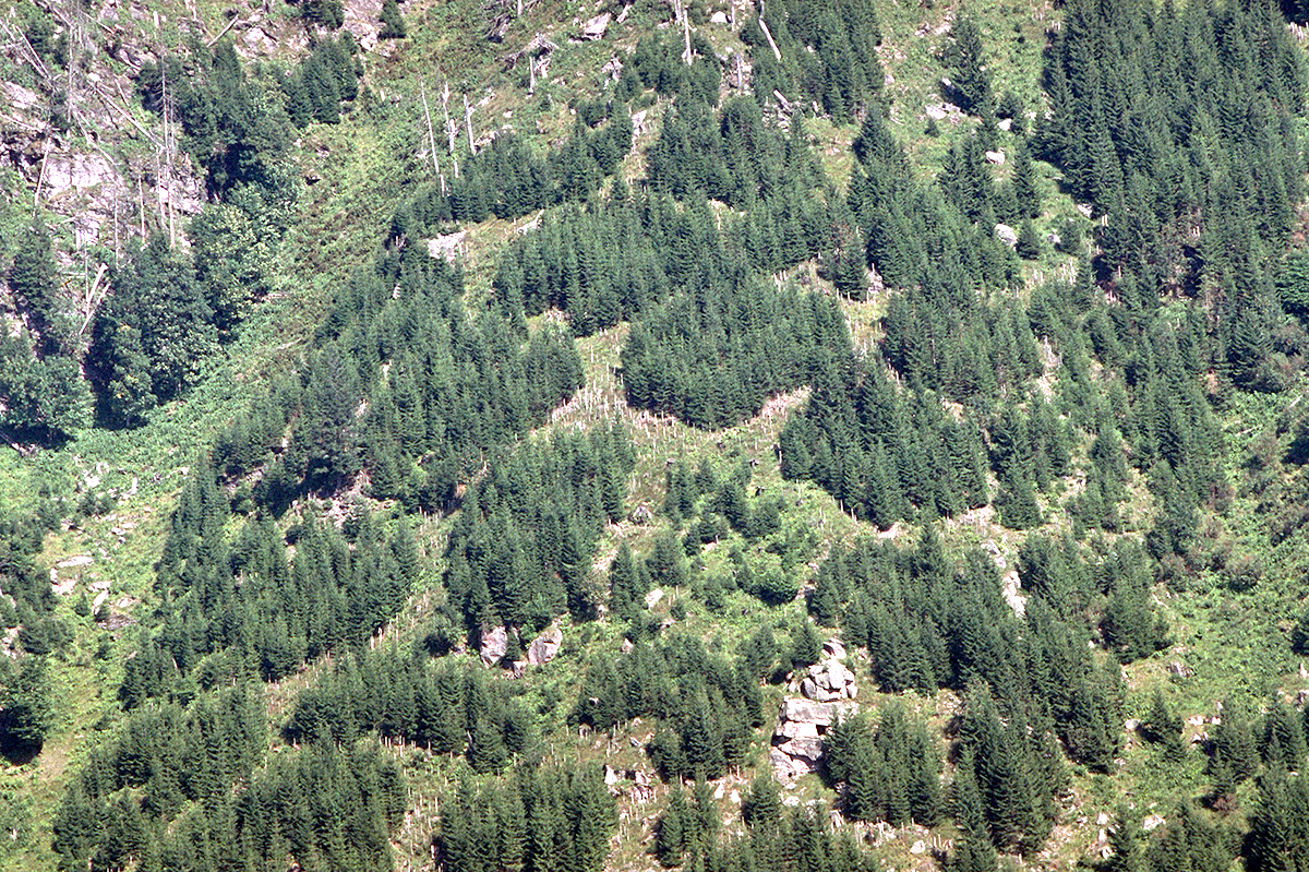 Seit der Jahrhundertwende haben Förster im Gebirgsraum grosse Flächen ausgepflanzt. Gleichmässige Hänge ohne ersichtliche Kleinstandortsunterschiede verleiten dazu, durchgehend und flächendeckend zu bepflanzen. Wo die grossflächigen Aufforstungen kaum je gepflegt wurden, sind oft zu dichte, gleichförmige, gleichaltrige, geschlossene, kurzkronige, dunkle und artenarme Stangenhölzer und schwache Baumholzbestände entstanden. Wälder mit derartiger Struktur sind labil gegenüber Wind, Schneelast und Parasiten. Stabilitätsprobleme sind von Anfang an vorprogrammiert.