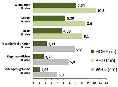 Die beste Wuchsleistung in Brusthöhe (BHD) und Höhe zeigt die heimische Weißkiefer, gefolgt von Spirke und Zirbe. Die Mazedonische Kiefer bleibt in der Wuchsleistung zurück, obwohl die Bäume mit 27 Jahren genauso alt sind wie die der Weißkiefer. Die Anpflanzungen der beiden nordamerikanischen Kiefern weisen ebenfalls ein signifikant schlechteres Wachstum als die heimischen Arten auf. Der Umstand, dass diese Pflanzen drei Jahre jünger sind, erklärt die großen und statistisch abgesicherten Unterschiede dennoch nicht.