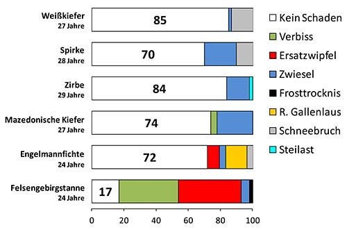 Bei der Analyse der beobachteten Schäden fällt eigentlich nur die Felsengebirgstanne heraus, bei der über 80 % aller Bäume durch Verbiss oder Ersatzwipfel (als Folge des Verbisses) geschädigt sind. Das führt uns deutlich vor Augen, dass die Problematik "Tanne und Wild" nicht auf die tieferen Lagen beschränkt ist, sondern 1:1 auf die Hochlagen umzusetzen ist. Bei allen anderen Arten liegt der Anteil geschädigter Bäume zwischen 15 und 30 %.