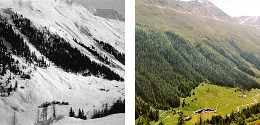 Abb. 2. Ausschnitt aus dem Untersuchungsgebiet "Dischma" im Jahr 1927 und 2000. Die Veränderung des Schutzwaldes ist augenfällig. Fotos: A. Issler / E. Bebi